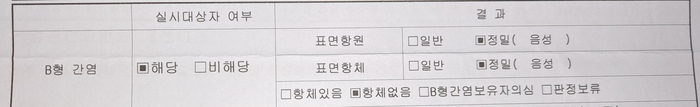 B형 간염 항체가 없다는 결과지